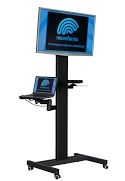 - stojak na kółkach multimedialny "T5M" z hakiem na TV, półką przednią oraz ruchomą półką boczną na laptopa
