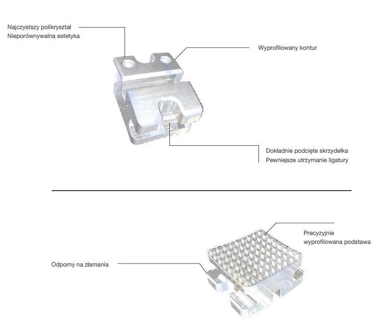 Wykonane są z najczystszego polikryształu, który w pełni komponuje się z naturalnym kolorem zębów pacjenta, tworząc jednocześnie mocny zamek odporny na uszkodzenia. Baza zamków anatomicznie dopasowana dla precyzyjnego umiejscowienia na powierzchni zęba. Siateczka na podstawie gwarantuje doskonałą siłę klejenia. Baza współpracuje ze wszystkimi rodzajami klejów. Gładkie krawędzie haczyków oraz niski profil zwiększają komfort pacjenta. Kolorowe oznakowania na każdym z zamków ułatwiają identyfikację i zapewniają odpowiednie pozycjonowanie zamka. Doskonały wybór dla pacjentów uczulonych na nikiel. Zamki dostępne w slocie .018 oraz .022, w preskrypcji Roth oraz MBT, z haczykami lub bez haczyków.