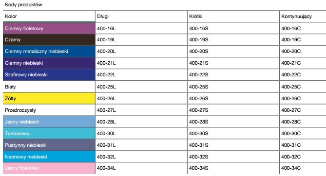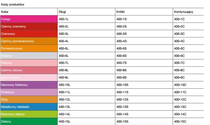 Dostępne w szerokiej gamie kolorów i odcieni. Z przerwami-krótką i długą oraz bez przerw (kontynuujące).