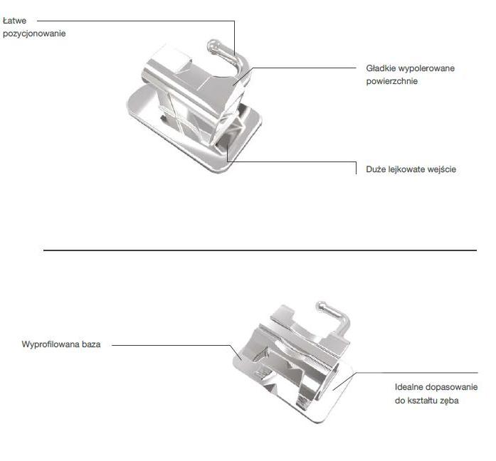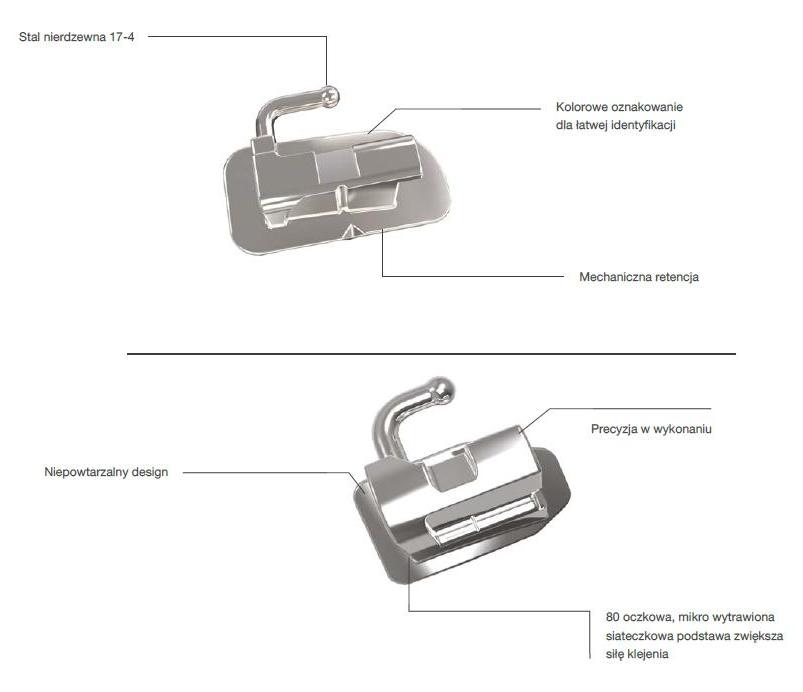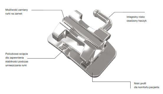Wykonane z jednego elementu techniką MIM. Mikro wytrawiona podstawa rurki ułatwia przyklejanie a idealnie wyprofilowana baza z dodatkową 80 oczkową siateczką, zwiększa siłę retencji. Gładkie, zaokrąglone powierzchnie i niski mezjalny haczyk zapewniają komfort pacjenta. Duże lejkowate wejście służy jako prowadnica podczas wkładania łuku. Kolorowe oznakowanie ułatwia identyfikację. Odpowiednie, policzkowe wyprofilowanie zapewnienia stabilności podczas umieszczania rurki i gwarantuje pewne uchwycenie pęsetą.