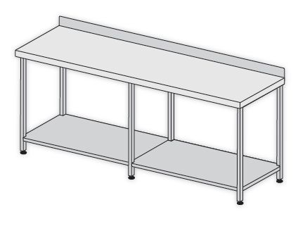 Stół roboczy. Wykonane w różnych konfiguracjach wymiarowych i rodzajowych. Standardowo wyposażone w regulatory wysokości, szuflady na prowadnicach rolkowych. Blaty robocze wykonane jako płaskie lub zagłębione z fartuchem tylnym. Standardowo wykonane jak pokazano na poniższych schematach ze stali kwasoodpornej gat. OH18N9. Na życzenie Zamawiającego blaty mogą być z innych materiałów zgodnie z zamieszczonym opisem (str. 129-132 katalogu). Szuflady typu skrzyniowego wykonane z tego samego materiału co korpus.