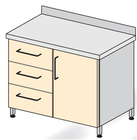 Szafki i szafy medyczne. Wykonane w różnych konfiguracjach wymiarowych i rodzajowych. Standardowo drzwi otwierane ze strony prawej na lewą lub na życzenie Zamawiającego odwrotnie. Wyposażone w jedną przestawną, regulowaną półkę. Elementy oszklone przeszklone szkłem bezpiecznym przezroczystym lub na zamówienie szkłem mlecznym światłoprzepuszczalnym. W standardzie stópki z regulacją wysokości. W szafach opisanych jako lekarskie, ubraniowe lub depozytowe zamki patentowe jednopunktowe lub wielopunktowe w standardzie. Blaty wykonane jako płaskie z fartuchem tylnym ściennym ze stali kwasoodpornej nierdzewnej. Na życzenie Zamawiającego mogą być wykonane jako zagłębione lub z innych materiałów (opis str. 129-132 katalogu). Szuflady na prowadnicach rolkowych o pełnym wysuwie. Konstrukcja szuflad skrzyniowa z tego samego materiału co korpus. W opcji zamki patentowe jedno- lub wielopunktowe typu baskwil.