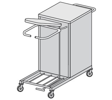 Wózek do przewożenia czystej i brudnej bielizny ze stelażem zamykanym mechanizmem pedałowym ze stali nierdzewnej kwasoodpornej. Wyposażenie: – dwie półki.