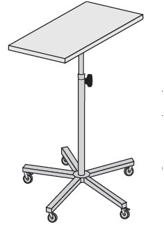 Stolik do zabiegów na ręce. Stoliki do instrumentów chirurgicznych. Wykonane w systemie ręcznej regulacji wysokości z blokadą typu zacisk lub z regulacją wysokości za pomocą pompy hydraulicznej przy użyciu dźwigni nożnej. Blat obracany o 360° z blokadą obrotu. Podstawa w kształcie litery T, Y lub H z kołami wyposażonymi w blokadę ruchu i obrotu.