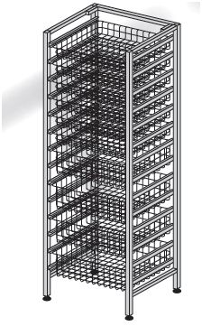 Regał systemowy wąski przystosowany do wyposażenia w kosze, kuwety i półki. Regały i wózki regałowe w systemie „TRIBO-med” wykonane są z profili kształtowych ze stali nierdzewnej kwasoodpornej lub ze stali czarnej lakierowanej farbami proszkowymi, a także w układzie mieszanym np.: ramy regałowe lakierowane farbami proszkowymi, a półki i kosze ze stali nierdzewnej. Standardowo wymiary dostosowane są do elementów wyposażenia zgodnego z modułem DIN-NORM (538×500 mm). Na życzenie Zamawiającego wyroby mogą być dostosowane do wyposażenia zgodnego z modułem ISO lub innego wynikającego z potrzeb użytkownika. Konstrukcja regałów i wózków regałowych, umożliwia dowolną konfigurację wyposażenia w kosze, kuwety i półki oraz jest kompatybilna z systemem mebli modułowych prezentowanych w tym katalogu. Wyposażenie regału: – kosz typ A-01 lub kuweta typ AA-11 – 6 szt. L=538, B=500, H=100 mm; – kosz typ A-02 lub kuweta typ AA-12 – 4 szt. L=538, B=500, H=180 mm.