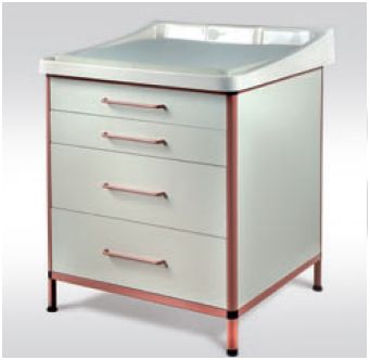 Stanowisko do pielęgnacji niemowląt – zabiegowe. Przeznaczenie: Stanowiska do pielęgnacji noworodków i niemowląt typ STP przeznaczone są do wykonywania wszystkich czynności, związanych z pielęgnacją dzieci na oddziałach położniczych, punktach pielęgnacyjnych, tradycyjnych salach noworodkowych oraz pokojach typu matka z dzieckiem. Charakterystyka: Elementy konstrukcyjne narożne z profili o zaokrąglonych krawędziach chroniących użytkownika przed urazami. Mocny i lekki szkielet tworzący konstrukcję mebla wypełniony laminowanymi płytami meblowymi, panelami z tworzywa, blachą lakierowaną lub nierdzewną, blat z wanienką wykonany z żywic szklano-poliestrowych. Wyposażenie standardowe stanowią: materacyk pokryty PCV, szuflady, kosze i kuwety wysuwne na materiały i środki pielęgnacyjne, syfon wodno-kanalizacyjny. W opcji doposażenie w baterię kąpielową termostatyczną. W zależności od potrzeb każde ze stanowisk może być dodatkowo wyposażone w ogrzewacz noworodków.
