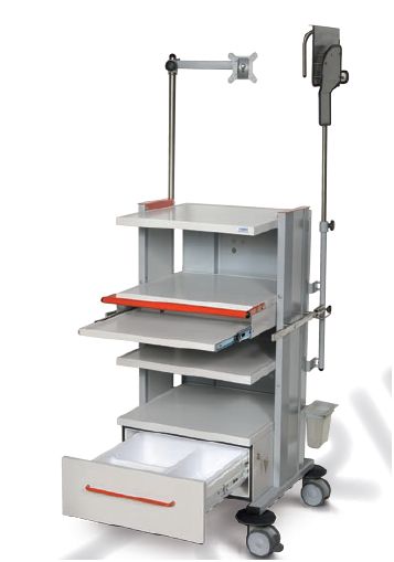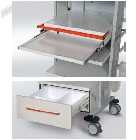 Wózki z proponowanej serii „TRIBO-MED” przystosowane są do specjalistycznej aparatury medycznej. Otwarta i sztywna konstrukcja słupowa umożliwia szybką zmianę konfiguracji rozstawu półek stosownie do oczekiwanych potrzeb. Szeroki asortyment specjalistycznych elementów wyposażenia dodatkowego gwarantuje niezbędny komfort pracy z zachowaniem wymaganej funkcji. Wymiary: • wysokość całkowita (przy zastosowaniu standardowych podwójnych kół jezdnych o średnicy Ř100 mm) w zależności od typu wózka wynosi: 860 mm; 1200 mm lub 1455 mm. • pozostałe wymiary gabarytowe i użytkowe podano szczegółowo w dalszej części katalogu dla każdego modelu wózka. Konstrukcja: • kolumny nośne z blachy stalowej profilowanej z rastrem do montażu półek. Zakres zmiany położenia półek środkowych ±30 mm od pozycji zwymiarowanych na rysunkach technicznych; • kontener i czoło szuflady metalowe, dwuwarstwowy, szczelny; • ramy szuflad na prowadnicach kulkowych z funkcją pełnego wysuwu; • wkłady szufladowe wykonane metodą termoformowania z wysokoudarowego tworzywa ABS w szerokiej gamie rodzajowej i wymiarowej z podziałami wewnętrznymi. Nośności użytkowe: • stelaż nośny 1500 N/150 kg; • półka stała 300 N/30 kg; • półka wysuwana 50 N/5 kg; • szuflada 150 N/15 kg. Powłoka lakiernicza: Wszystkie elementy pokryte są wysokiej jakości lakierem proszkowym, odpornym na uszkodzenia mechaniczne, działanie środków dezynfekcyjno-myjących i promieniowanie UV w pełnej gamie kolorystycznej, zgodnej z paletą barw wg RAL. Kolorystyka standardowa: • konstrukcja nośna i kontener szufladowy w kolorze podstawowym RAL 7040; • półki w kolorze podstawowym RAL 7047. Wózki do aparatury medycznej z serii „TRIBO-MED” to: • bogaty wybór specjalistycznego wyposażenia dodatkowego zgodnie z wykazem elementów wyposażenia; • raster montażowy umożliwiający samodzielną zmianę rozstawu półek; • kanał kablowy z rozgałęziaczem elektrycznym wielogniazdowym; • półki z wykonstruowanymi podwyższonymi brzegami zapewniające dużą sztywność oraz bezpieczeństwo ustawionych urządzeń i aparatury; • półka wysuwna do klawiatury komputerowej gwarantująca komfort obsługi aparatury; • uchwyt wózka umożliwiający wygodne przemieszczanie w całości wyposażonego wózka; • pojemnik szufladowy z zamocowaną uszczelką szufladową i zamkiem patentowym w standardzie; • szuflady poruszające się na prowadnicach teleskopowych typu kulkowego, z mechanizmem zapewniającym właściwy docisk frontu szuflady do uszczelki; • front szufladowy metalowy stabilnie zamontowany do szuflady z ergonomicznym uchwytem; • szeroki wybór kolorystyczny; • wymienny wkład do szuflady wykonany z wysokoudarowego tworzywa ABS gwarantujący łatwość utrzymania niezbędnego standardu higienicznego dla przechowywanych materiałów. • zespół jezdny zbudowany z 4 podwójnych rolek o średnicy Ř100 mm. Koła wykonane z materiału antystatycznego i niebrudzącego podłoże. Dwa koła wyposażone w hamulec i blokadę obrotu; • odboje zabezpieczające korpus i osprzęt wózka przed uszkodzeniem.