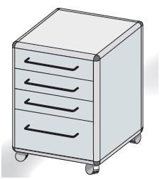 Szafka przejezdna pod ladę. Standardowo wyposażone w szuflady monolityczne z tworzywa ABS, półki przestawne z regulacją wysokości położenia. W opcji zamki patentowe pojedyncze i centralne.