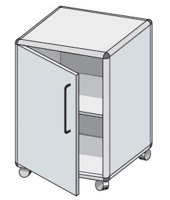 Szafka przejezdna samodzielna. Standardowo wyposażone w szuflady monolityczne z tworzywa ABS, półki przestawne z regulacją wysokości położenia. W opcji zamki patentowe pojedyncze i centralne.