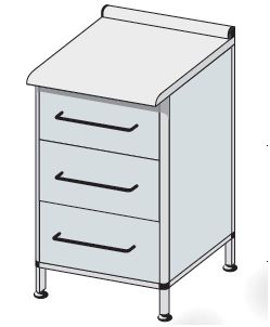 Szafka przyścienna jednokomorowa. Wykonane w różnych konfiguracjach wymiarowych i rodzajowych. Standardowo drzwi otwierane są ze strony prawej na lewą lub na życzenie Zamawiającego odwrotnie. Wyposażone w jedną przestawną, regulowaną półkę. W standardzie stópki z regulacją wysokości, zamki patentowe jedno- lub wielopunktowe. Blaty robocze z fartuchem tylnym. Standardowo wykonane jak pokazano na poniższych schematach jako laminowane. Na życzenie Zamawiającego blaty mogą być z innych materiałów zgodnie z zamieszczonym opisem (str. 129-132 katalogu). Szuflady typu skrzyniowego wykonane z tworzywa ABS z wyoblonymi i szczelnymi krawędziami wewnętrznymi w różnym asortymencie wymiarowym.