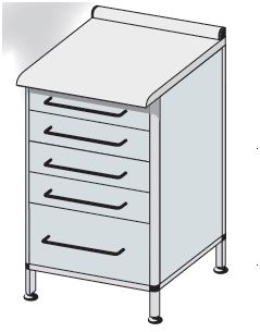 Szafka przyścienna jednokomorowa. Wykonane w różnych konfiguracjach wymiarowych i rodzajowych. Standardowo drzwi otwierane są ze strony prawej na lewą lub na życzenie Zamawiającego odwrotnie. Wyposażone w jedną przestawną, regulowaną półkę. W standardzie stópki z regulacją wysokości, zamki patentowe jedno- lub wielopunktowe. Blaty robocze z fartuchem tylnym. Standardowo wykonane jak pokazano na poniższych schematach jako laminowane. Na życzenie Zamawiającego blaty mogą być z innych materiałów zgodnie z zamieszczonym opisem (str. 129-132 katalogu). Szuflady typu skrzyniowego wykonane z tworzywa ABS z wyoblonymi i szczelnymi krawędziami wewnętrznymi w różnym asortymencie wymiarowym.