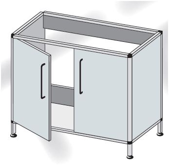 Szafka przyścienna pod zlewozmywak. Wykonane w różnych konfiguracjach wymiarowych i rodzajowych. Standardowo drzwi otwierane są ze strony prawej na lewą lub na życzenie Zamawiającego odwrotnie. Wyposażone w jedną przestawną, regulowaną półkę. W standardzie stópki z regulacją wysokości, zamki patentowe jedno- lub wielopunktowe. Blaty robocze z fartuchem tylnym. Standardowo wykonane jak pokazano na poniższych schematach jako laminowane. Na życzenie Zamawiającego blaty mogą być z innych materiałów zgodnie z zamieszczonym opisem (str. 129-132 katalogu). Szuflady typu skrzyniowego wykonane z tworzywa ABS z wyoblonymi i szczelnymi krawędziami wewnętrznymi w różnym asortymencie wymiarowym.