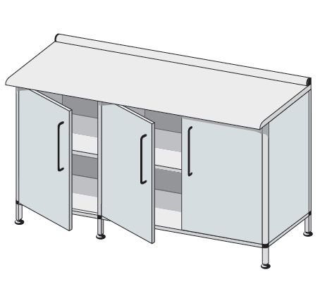 Zabudowa przyścienna dwukomorowa. Wykonane w różnych konfiguracjach wymiarowych i rodzajowych. Standardowo drzwi otwierane są ze strony prawej na lewą lub na życzenie Zamawiającego odwrotnie. Wyposażone w jedną przestawną, regulowaną półkę. W standardzie stópki z regulacją wysokości, zamki patentowe jedno- lub wielopunktowe. Blaty robocze z fartuchem tylnym. Standardowo wykonane jak pokazano na poniższych schematach jako laminowane. Na życzenie Zamawiającego blaty mogą być z innych materiałów zgodnie z zamieszczonym opisem (str. 129-132 katalogu). Szuflady typu skrzyniowego wykonane z tworzywa ABS z wyoblonymi i szczelnymi krawędziami wewnętrznymi w różnym asortymencie wymiarowym.