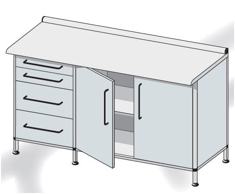 Zabudowa przyścienna dwukomorowa. Wykonane w różnych konfiguracjach wymiarowych i rodzajowych. Standardowo drzwi otwierane są ze strony prawej na lewą lub na życzenie Zamawiającego odwrotnie. Wyposażone w jedną przestawną, regulowaną półkę. W standardzie stópki z regulacją wysokości, zamki patentowe jedno- lub wielopunktowe. Blaty robocze z fartuchem tylnym. Standardowo wykonane jak pokazano na poniższych schematach jako laminowane. Na życzenie Zamawiającego blaty mogą być z innych materiałów zgodnie z zamieszczonym opisem (str. 129-132 katalogu). Szuflady typu skrzyniowego wykonane z tworzywa ABS z wyoblonymi i szczelnymi krawędziami wewnętrznymi w różnym asortymencie wymiarowym.