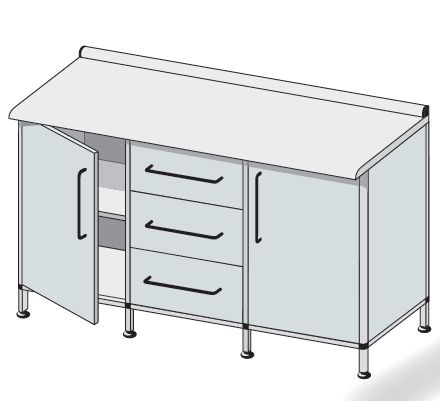Zabudowa przyścienna trzykomorowa. Wykonane w różnych konfiguracjach wymiarowych i rodzajowych. Standardowo drzwi otwierane są ze strony prawej na lewą lub na życzenie Zamawiającego odwrotnie. Wyposażone w jedną przestawną, regulowaną półkę. W standardzie stópki z regulacją wysokości, zamki patentowe jedno- lub wielopunktowe. Blaty robocze z fartuchem tylnym. Standardowo wykonane jak pokazano na poniższych schematach jako laminowane. Na życzenie Zamawiającego blaty mogą być z innych materiałów zgodnie z zamieszczonym opisem (str. 129-132 katalogu). Szuflady typu skrzyniowego wykonane z tworzywa ABS z wyoblonymi i szczelnymi krawędziami wewnętrznymi w różnym asortymencie wymiarowym.