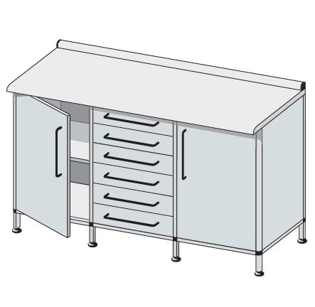 Zabudowa przyścienna trzykomorowa. Wykonane w różnych konfiguracjach wymiarowych i rodzajowych. Standardowo drzwi otwierane są ze strony prawej na lewą lub na życzenie Zamawiającego odwrotnie. Wyposażone w jedną przestawną, regulowaną półkę. W standardzie stópki z regulacją wysokości, zamki patentowe jedno- lub wielopunktowe. Blaty robocze z fartuchem tylnym. Standardowo wykonane jak pokazano na poniższych schematach jako laminowane. Na życzenie Zamawiającego blaty mogą być z innych materiałów zgodnie z zamieszczonym opisem (str. 129-132 katalogu). Szuflady typu skrzyniowego wykonane z tworzywa ABS z wyoblonymi i szczelnymi krawędziami wewnętrznymi w różnym asortymencie wymiarowym.