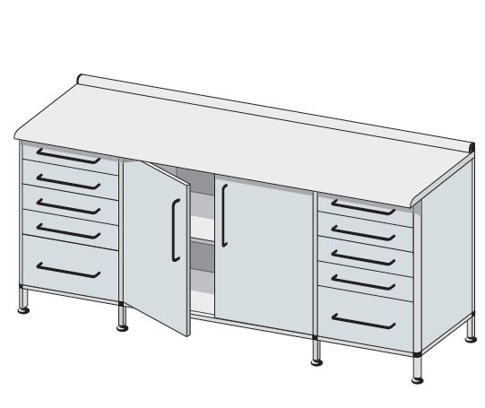 Zabudowa przyścienna trzykomorowa. Wykonane w różnych konfiguracjach wymiarowych i rodzajowych. Standardowo drzwi otwierane są ze strony prawej na lewą lub na życzenie Zamawiającego odwrotnie. Wyposażone w jedną przestawną, regulowaną półkę. W standardzie stópki z regulacją wysokości, zamki patentowe jedno- lub wielopunktowe. Blaty robocze z fartuchem tylnym. Standardowo wykonane jak pokazano na poniższych schematach jako laminowane. Na życzenie Zamawiającego blaty mogą być z innych materiałów zgodnie z zamieszczonym opisem (str. 129-132 katalogu). Szuflady typu skrzyniowego wykonane z tworzywa ABS z wyoblonymi i szczelnymi krawędziami wewnętrznymi w różnym asortymencie wymiarowym.