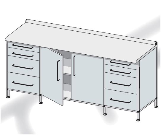 Zabudowa przyścienna trzykomorowa. Wykonane w różnych konfiguracjach wymiarowych i rodzajowych. Standardowo drzwi otwierane są ze strony prawej na lewą lub na życzenie Zamawiającego odwrotnie. Wyposażone w jedną przestawną, regulowaną półkę. W standardzie stópki z regulacją wysokości, zamki patentowe jedno- lub wielopunktowe. Blaty robocze z fartuchem tylnym. Standardowo wykonane jak pokazano na poniższych schematach jako laminowane. Na życzenie Zamawiającego blaty mogą być z innych materiałów zgodnie z zamieszczonym opisem (str. 129-132 katalogu). Szuflady typu skrzyniowego wykonane z tworzywa ABS z wyoblonymi i szczelnymi krawędziami wewnętrznymi w różnym asortymencie wymiarowym.