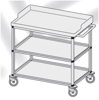 Stolik opatrunkowo-zabiegowy. Stoliki zabiegowe są wykonane w różnych konfiguracjach wymiarowych i rodzajowych. Standardowo wyposażone w zespoły jezdne z blokadą ruchu i obrotu oraz z odbojami zabezpieczającymi stolik i elementy otoczenia przed uszkodzeniem. Blaty robocze z tworzywa ABS standardowo wykonane jak pokazano na poniższych schematach z krawędzią boczną podniesioną lub bez krawędzi bocznych. Na życzenie Zamawiającego blaty mogą być wykonane z innych materiałów.