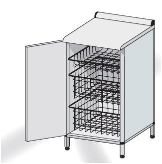 Szafka przyścienna z koszami. Szafy i szafki standardowo wyposażone w prowadnicę modułową z tworzywa ABS lub systemowe wysuwane metalowe ramy do osadzenia koszy i kuwet z tworzywa. Proponowane przykładowe wyposażenie może być modyfikowane zgodnie z tabelą wyposażenia na str. 63 katalogu, z zachowaniem podanych ilości przy opisanych gabarytach organizerów. W opcji zamki patentowe jedno- i wielopunktowe typu baskwil. Szerokość szafki B=600 mm jest wymiarem gabarytowym z blatem roboczym. Szerokość szafki wynosi 550 mm. Wyposażenie: – kosz typ A-01 lub kuweta typ AA-11 – 1 szt. L=538, B=500, H=100 mm – kosz typ A-02 lub kuweta typ AA-12 – 2 szt. L=538, B=500, H=180 mm.
