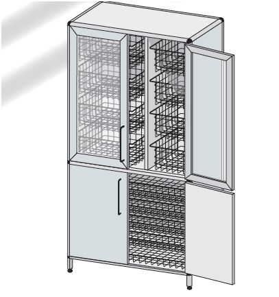 Szafa opatrunkowo-zabiegowa przeszklona górą z koszami. Wyposażenie: – kosz typ A-02 lub, kuweta typ AA-12 – 4 szt., L= 538, B=500, H=180 mm, – kosz typ A-05 – 4 szt, L=268, B=500, H=180 mm, – kosz typ A-03 – 6 szt. L=835, B=500, H=100 mm.
