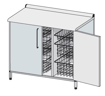 Szafka przyścienna z koszami. Szafy i szafki standardowo wyposażone w prowadnicę modułową z tworzywa ABS lub systemowe wysuwane metalowe ramy do osadzenia koszy i kuwet z tworzywa. Proponowane przykładowe wyposażenie może być modyfikowane zgodnie z tabelą wyposażenia na str. 63 katalogu, z zachowaniem podanych ilości przy opisanych gabarytach organizerów. W opcji zamki patentowe jedno- i wielopunktowe typu baskwil. Szerokość szafki B=600 mm jest wymiarem gabarytowym z blatem roboczym. Szerokość szafki wynosi 550 mm. Wyposażenie: – kosz typ A-01 lub kuweta typ AA-11 – 1 szt. L=538, B=500, H=100 mm – kosz typ A-02 lub kuweta typ AA-12 – 2 szt. L=538, B=500, H=180 mm – kosz typ A-04 – 1 szt. L=268, B=500, H=100 mm – kosz typ A-05 – 2 szt. L=268, B=500, H=180 mm.