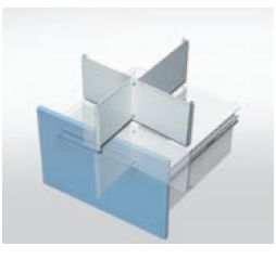 Wkład do szuflady wysokiej. Metalowy lakierowany techniką proszkową w kolorze białym. Konstrukcja umożliwia samodzielny montaż i demontaż oraz zmianę podziału szuflady jak W 235.