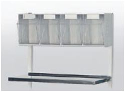 Półka dostawiana górna. Ze stali kwasoodpornej W 241 z dozownikiem czteroskrzynkowym na materiały opatrunkowo-zabiegowe. Skrzynki uchylne w wymiarze (szer. × gł. × wys.) 130×125×190 mm. Wysokość półki nad blatem roboczym 280 mm. Wymiary półki (szer. × gł.) 590×280 mm
