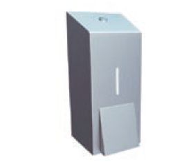 Dozownik do mydła w płynie lub płynu dezynfekcyjnego. Cechy: – mydło lub płyny uzupełniane z kanistra; – zabezpieczony trwałym stalowym zamkiem; bębenkowym; – zamek zlicowany z powierzchnią urządzenia; – łączenia boków spawane i szlifowane; – niewidoczne zawiasy.
