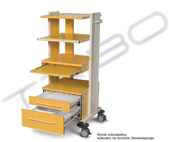 Wyrób indywidualny wykonany na życzenie Zamawiającego. Model bazowy WA 54/40K z kontenerem dwuszufladowym doposażony: – uchwyt uniwersalny nr kat. W 132; – szyna sprzętowa nr kat. W 202; – wkład szufladowy: • niski nr kat. W 271; • średni nr kat. W 275. Z uwagi na różnorodne gabaryty stosowanych urządzeń medycznych, w proponowanej serii wózków do aparatury medycznej wyróżniamy dwie podstawowe długości półek L=640 mm oraz L=540 mm, co zobrazowane jest w oznaczeniu typu wózka. w wykonaniu standardowym: – regulacja wysokości półek środkowych w górę/dół co 30 mm w zakresie ±60 mm od pozycji zwymiarowanej na rysunku technicznym; – wysuwana półka do klawiatury komputerowej nr kat. W 131; – zamek patentowy szuflady; – kanał kablowy z rozgałęziaczem elektrycznym 4-gniazdowym nr kat. W 121. Wymiary gabarytowe półki [mm]:górna/dolna: 565×540; środkowe: 525×540. Wymiary użytkowe półki [mm]: górna/dolna: 495×470; środkowe: 455×470.