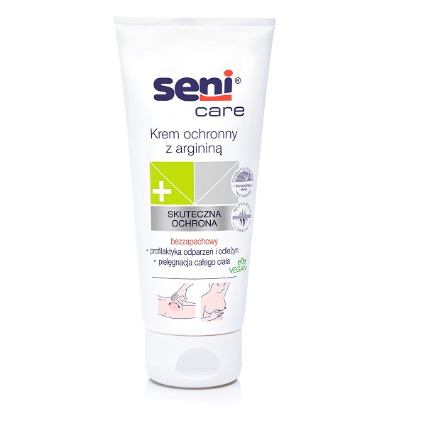 Krem ochronny z arganiną Seni Care. Krem ochronny z argininą i SINODOREM®. Zapobiega powstawaniu stanów zapalnych, odparzeń i odleżyn; łagodzi nieprzyjemne objawy suchości i napięcia skóry; łagodzi podrażnienia, działa nawilżająco i wspomaga regenerację skóry; ma lekką konsystencję, prawie całkowicie się wchłania, pozostawiając na skórze przezroczysty ochronny film. Polecany do: zabezpieczania zagrożonych odleżynami i odparzeniami miejsc. Nanieść na zagrożone partie ciała i pozostawić do wchłonięcia.