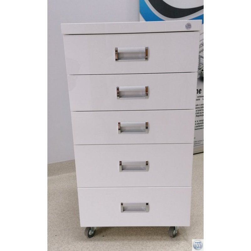 Asystor stomatologiczny AS - 5 to szafka na kółkach umożliwiających łatwe i sprawne jej przemieszczanie. Dodatkowo aby ułatwić przechowywanie przedmiotów o różnych rozmiarach szafka posiada dwie większe oraz trzy mniejsze szuflady. Gwarancja producenta wynosi 24 miesiące.