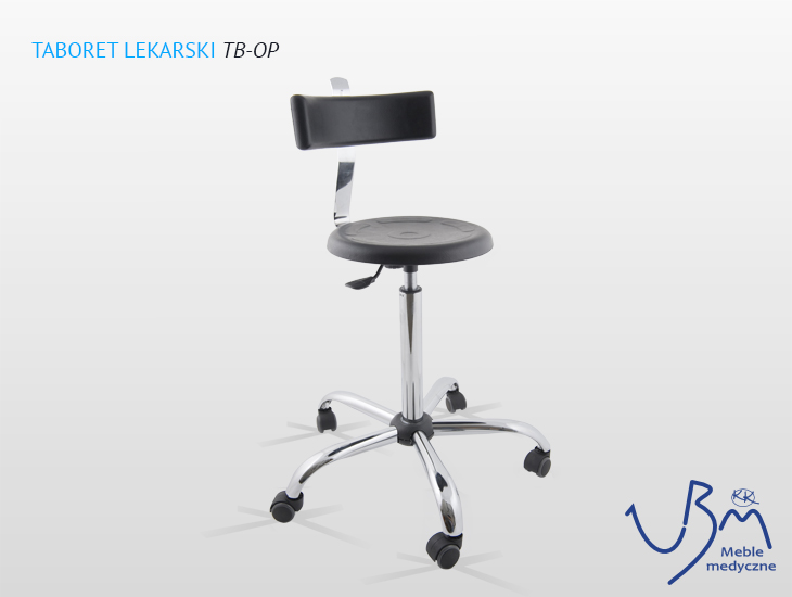 Krzesło / taboret lekarski do gabinetów medycznych, przychodni, gabinetów stomatologicznych i szpitalnych gabinetów zabiegowych. Mebel medyczny wykonany został z materiału pozwalającego na łatwe utrzymanie czystości - siedzisko wykonane z poliuretanu w kolorze czarnym. Taboret posiadaja wygodne obrotowe siedzisko, możliwość regulowania wysokości i oparcia. Kółka do łatwego przemieszczania.