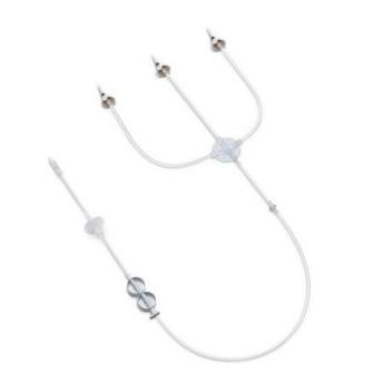 Sterylny wężyk pompy, wyposażony w trzy igły przebijające środki z kontrastem i NaCl zabezpieczone kapturkami ochronnymi.
