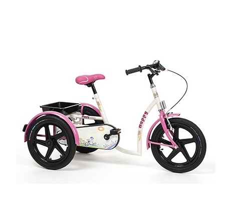 Rehabilitacyjny rowerek trójkołowy. Kolorystyka oraz ozdoby sprawiają, że rowerek jest dedykowany dla dziewczynek. Doskonałe narzędzie terapeutyczne i rehabilitacyjne dla dzieci z MPD. Rower jest również idealny dla dzieci z zachwianym poczuciem równowagi, z zaburzeniami ruchu. Ruch stymulująco wpływa na utrzymanie układu kostno mięśniowego w dobrej kondycji. Poprawia krążenie, oddychanie, ogólnie wzmacnia organizm. Rowery motywują do działania szczególnie dzieci. Dzięki rowerowi dzieci łatwiej integrują się z rówieśnikami.