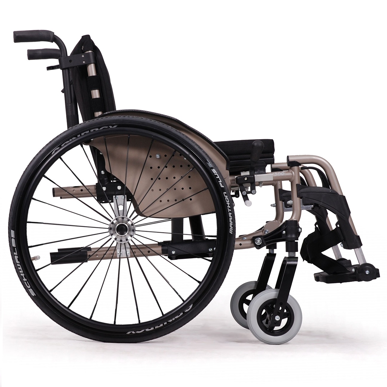 Wózek inwalidzki V300 ACTIVE wykonany został ze stopów lekkich. Aluminiowa konstrukcja krzyżakowa jest jednocześnie niebywale lekka i trwała. Modułowa budowa wózka pozwala na jego rozbudowę o dodatkowe opcje spełniające bieżące wymagania użytkownika. Dodatkowo w każdej chwili istnieje możliwość zmiany takich parametrów jak: wysokość siedziska od podłoża, głębokość siedziska, kąt nachylenia siedziska. Tapicerka wózka wykonana została z solidnego materiału, zapewniającego trwałość i niezawodność podczas aktywnego użytkowania.