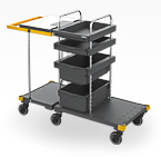 Wózek przeznaczony do utrzymania czystości w obiektach o wysokich reżimach. Poszerzony o moduł do mycia podłóg i kodowane kolorystycznie wiadra zapewniają wszystko, co potrzebne do szeroko pojętych prac utrzymania czystości i transportu odpadów. Składany pojemnik na odpady umożliwia nieskomplikowaną redukcję powierzchni postojowej.