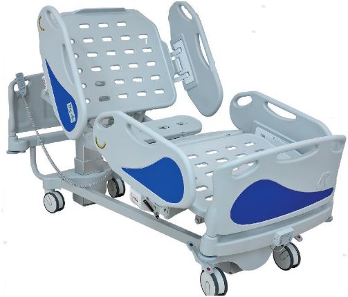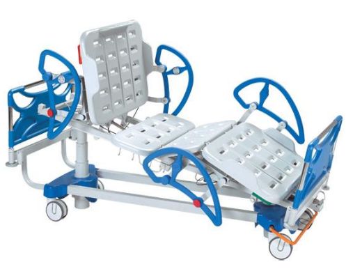 ruchomą sekcją pleców (auto-regresja) i ud regulowanymi siłownikami elektrycznymi, stałą sekcją miednicy oraz sekcją podudzia regulowaną tłokiem gazowym, Szczyty łóżka i poręcze boczne wykonane z polietylenu. Rama nośna wykonana z kwadratowych profili stalowych (mm 40x40x2), wyposażona w gumowe koła odbojowe o średnicy 90 mm umieszczone na wszystkich narożnikach zewnętrznych, 4 uchwyty statywu kroplówki lub wysięgnika ręki we wszystkich rogach łóżka. Rama łóżka wyposażona w 4 haczyki na każdej stronie leża do zawieszenia akcesoriów. Rama malowana farbą epoksydową i suszona w piecu tunelowym w temperaturze 200 ° C. • Leże szersze od ramy łóżka ułatwiające czynności personelu pielęgniarskiego. Zaprojektowane i wyprodukowane zgodnie z normami bezpieczeństwa. Rama leża wykonana z rur stalowych o przekroju okrągłym (32x2), bez ostrych krawędzi, pokryta termicznie kształtowanymi, odpornymi na plamy i zadrapania wypraskami z tworzywa ABS. Wypraski wyposażone w zintegrowane uchwyty materaca, łatwo demontowane dla celów czyszczenia i odkażania.