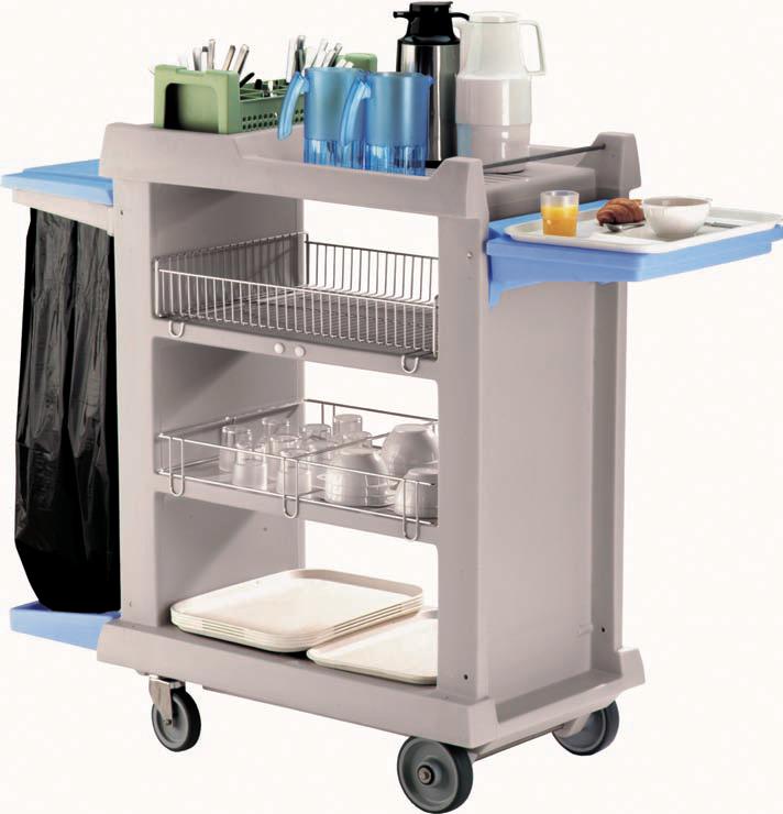 Wózek do przygotowywania posiłków z 3 dodatkowymi półkami ze stali nierdzewnej na 12 kompletów. Wózek zaprojektowany do rozwożenia i częściowego przygotowywania drobnych posiłków np. śniadań. Wyjmowany koszyk na sztućce. Składany uchwyt na worki na odpadki. Składana boczna taca. Ściany wózka wykonanez polietylenu. 2 stałe półki z 3 przestrzeniami roboczymi. 2 stałe koła O 160 mm. 2 skrętne koła O 125 mm. Wózek dotransportu potraw z drzwiami.