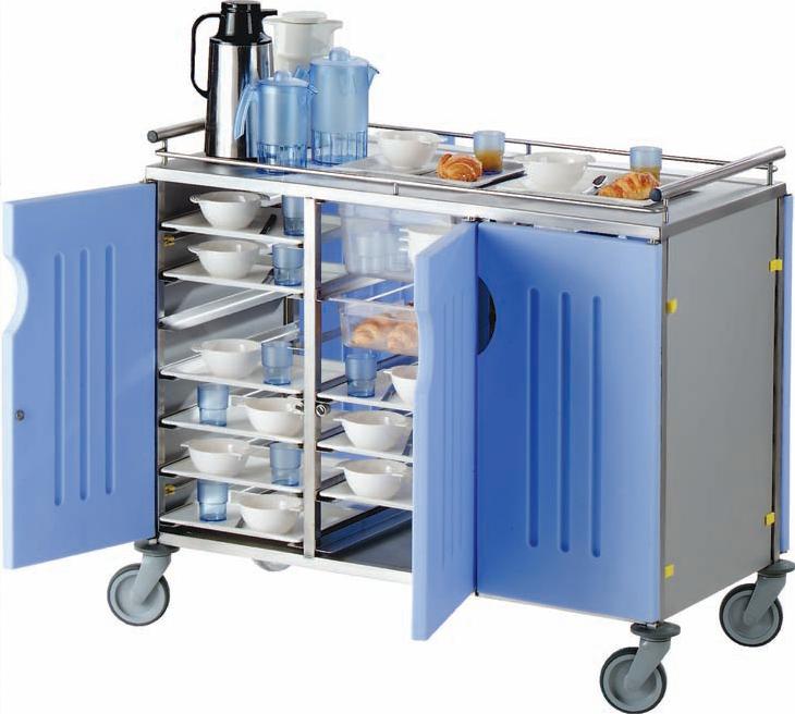2 przedziały z 4 drzwiami: dla 12 tac 530 x 325 lub 24 tac 265 x 325 i kontenery gastronomiczne z poliwęglanu do powieszenia na górnym poziomie. Miejsce pomiędzy dwoma poziomami 9,8 cm. Elementy konstrukcyjne wózka ze stali nierdzewnej. Podłoga wózka ze stali nierdzewnej. Koła O 125 mm. Panele boczne i drzwi z tworzywa sztucznego. Blat o grubości 15/10 – tłumiący dźwięki. Uchwyt na blacie z każdej strony.