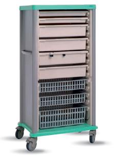 Szafa medyczna w systemie ADAPTIS 600 x 400. 17 modułów H 155 cm. System ADAPTIS umożliwia również tworzenie wysokiej zabudowy meblowej - szaf mobilnych. Szafy formatu 600x400mm są kompatybilne z całym zakresem wyposażenia ADAPTIS (szuflady, pojemniki, półki itp.). Koła jezdne pozwalają na przemieszczanie szaf w obrębie pomieszczeń. Uchwyt do prowadzenia z lewej strony szafy. Wyprofilowane tworzywowe panele boczne i tylne. Podstawa ze zderzakami (odbojami) wykonana z tworzywa ABS. Koła O 125 mm, w tym dwa z blokadą. Górny blat z tworzywa ABS.