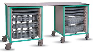 Stół mobilny w systemie ADAPTIS z szufladami (2 x 9 modułów). Dwie połączone kolumny z wolną przestrzenią pomiędzy nimi. System ADAPTIS umożliwia tworzenie dużych przestrzeni roboczych - blatów do pracy wraz z przestrzenią do składowania, segregowania. Koła jezdne pozwalają na przemieszczanie stołów w obrębie pomieszczeń. Konstrukcja stołów oparta jest na stalowej ramie pokrytej lakierem proszkowym odpornym na uszkodzenia. Górny blat wykonany z laminatu o grubości 12 mm w kolorze beżowym. Wyjmowane szuflady z pełnym wysuwem – opcja. Koła O 125 mm, w tym dwa z blokadą. Panele boczne wykonane z tworzywa sztucznego. Kolorystyka ramy do wyboru: zielony, pomarańczowy, ceglasty, fioletowy, niebieski.