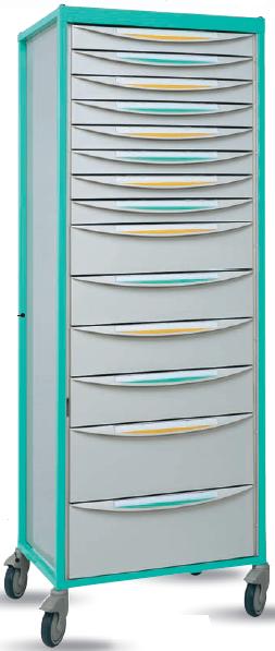 Szafy medyczne w systemie Adaptis - Economy z szufladami. System prostych szaf oparty na konstrukcji stelażowej. Podstawowy rozmiar szaf to 600 x 400 mm podobnie jak ADAPTIS, a więc jest kompatybilny z całym zakresem wyposażenia ADAPTIS (szuflady, pojemniki, półki itp.). Szafy dostępne są w 2 rozmiarach wysokości i szerokości. Koła jezdne pozwalają na przemieszczanie szaf w obrębie pomieszczeń. Rama szafy stalowa, lakierowana. Koła O 125 mm, w tym dwa z blokadą. Warianty kolorystyczne: zielony, pomarańczowy, ceglasty, fioletowy, niebieski. 22 modułów (20 prowadnic).