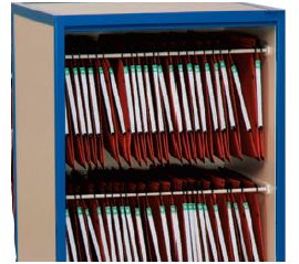 Wiszące uchwyty na dokumentację medyczną w pionowym układzie.