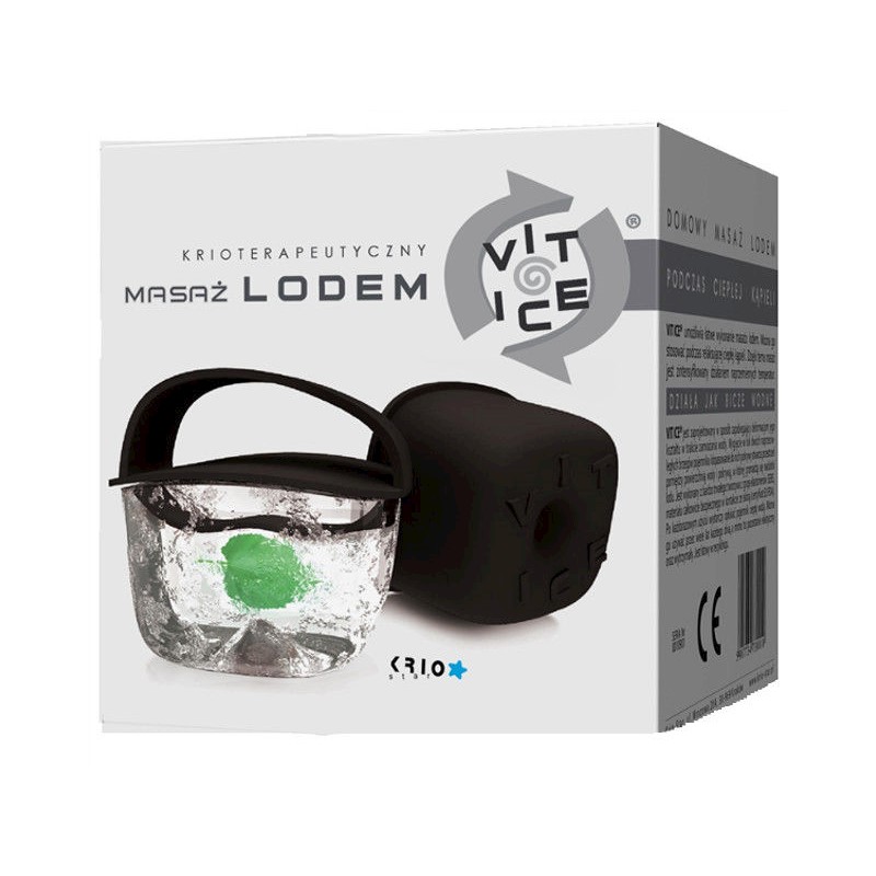 Przyrząd do masażu lodem Vit-Ice- masaż lodem zalicza się do zabiegów miejscowych o temperaturze oziębiania ok. 0°C. Ma zastosowanie w urodzie, fizjoterapii, oraz w sporcie wyczynowowym i rekreacyjnym. Jego atrakcyjność polega na połączeniu stymulacji zimnem i masażem. Jest niezwykle prosty w obsłudze. Wystarczy wlać do pojemnika VIT ICE wodę, przykryć pokrywą kotwiczącą lód i zamrozić. Objętość bryły lodu pozwala na masaż lodem trwający od 10 do nawet 27 minut. Łatwość wykonania masażu lodem dzięki VIT ICE pozwala na zastosowanie go zarówno w ośrodkach leczniczych jak również w warunkach domowych.Kształt przyrządu zapobiega jego deformacjom w trakcie formowania lodu.