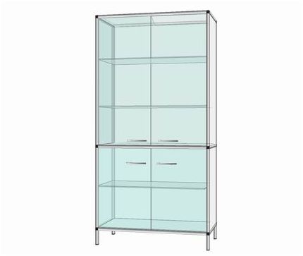 Safa dwudrzwiowa pełna - drzwi szklane. Dowolny wymiar w zakresie 700-1200x250-600x1500-2000. Każdy mebel wykonany w tej technologii posiada szkielet - z anodowanych profili aluminiowych. Konstrukcja jest wyjątkowo mocna a zarazem lekka. Stosuje się cała gamę profili o różnych przekrojach, które dobierane są w zależności od przeznaczenia mebli, ich wielkości i wytrzymałości. Zaokrąglone kształty profili tworzących krawędzie - chronią użytkowników przed urazami. Ich powierzchnie pokryte są kolorową okleiną z PCV. Szkielet tworzący konstrukcję może być wypełniany płytami laminowanymi, szkłem lub blachą. Wszystkie pozostałe komponenty mebli tj. zawiasy, prowadnice szuflad, zamki - to konstrukcje wyjątkowo funkcjonalne, wykonane w najwyższym standardzie jakości. Meble są wyjątkowo estetyczne i przystosowane do intensywnej eksploatacji.