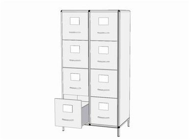 Każdy mebel wykonany w tej technologii posiada szkielet - z anodowanych profili aluminiowych. Konstrukcja jest wyjątkowo mocna a zarazem lekka. Stosuje się cała gamę profili o różnych przekrojach, które dobierane są w zależności od przeznaczenia mebli, ich wielkości i wytrzymałości. Zaokrąglone kształty profili tworzących krawędzie - chronią użytkowników przed urazami. Ich powierzchnie pokryte są kolorową okleiną z PCV. Szkielet tworzący konstrukcję może być wypełniany płytami laminowanymi, szkłem lub blachą. Wszystkie pozostałe komponenty mebli tj. zawiasy, prowadnice szuflad, zamki - to konstrukcje wyjątkowo funkcjonalne, wykonane w najwyższym standardzie jakości. Meble są wyjątkowo estetyczne i przystosowane do intensywnej eksploatacji. Wymiary: 880 x 560 x 1750 (wys.) mm.
