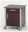 Szafka przyłóżkowa z ramą wykonaną z aluminium. Dostęp do szafki możliwy z dwóch stron. Użyte materiały są łatwe do czyszczenia i dezynfekcji. Dwa kółka wyposażone w hamulce.