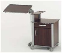 Szafka przyłóżkowa z ramą wykonaną z aluminium z blatem bocznym. Dostęp do szafki możliwy z dwóch stron. Użyte materiały są łatwe do czyszczenia i dezynfekcji. Szafka wyposażona w 5 kółek dla lepszej stabilności, dwa z nich wyposażone są w hamulce.
