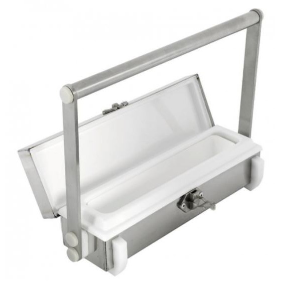 Osłonne pojemniki skonstruowano do przenoszenia strzykawek wypełnionych radiofarmaceutykami lub źródeł o małych aktywnościach. Pojemnik jest wykonany ze stali nierdzewnej pokrywającej ołów. Wewnętrzna plastikowa wyściółka oraz wyjmowana tacka są łatwe do czyszczenia. Przymocowana rączka zapewnia bezpieczne przenoszenie a solidna, szeroka podstawa zapewnia stabilne położenie, zwłaszcza gdy pokrywa jest otwarta. Osłaniająca pokrywa umocowana na zawiasach zamykana jest na zamekzatrzaskowy.